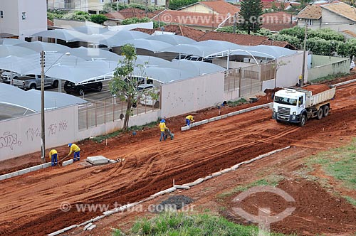 •  Workers working on laying curb on paved street  - Sao Jose do Rio Preto city - Sao Paulo state (SP) - Brazil