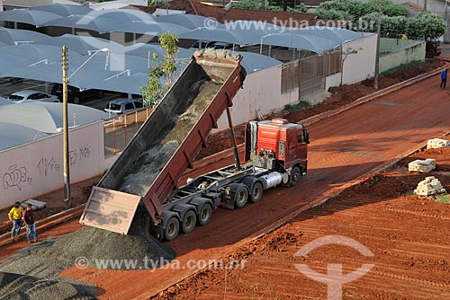 Dump truck unloads stone on paved street - Sao Jose do Rio Preto city - Sao Paulo state (SP) - Brazil
