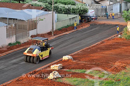 Road roller working on paved street - Sao Jose do Rio Preto city - Sao Paulo state (SP) - Brazil