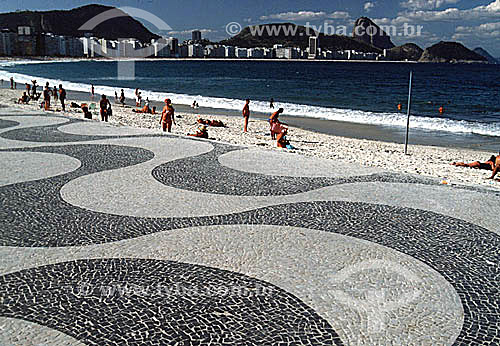 •  Detail of Copacabana Promenade (*) with the beach and Sugar Loaf Mountain in the background - Rio de Janeiro city - Rio de Janeiro state - Brazil  (*) The Avenida Atlantica (Atlantic Avenue) was inaugurated in 1906 with only one lane. The existing C