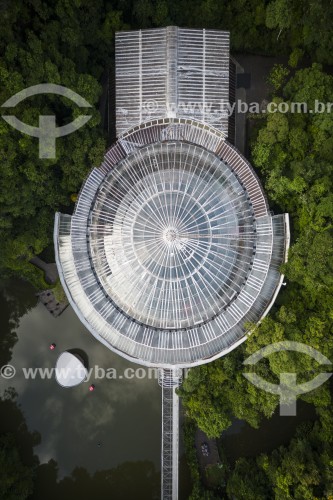 Picture taken with drone of the Opera de Arame - using pipes as structure and is perfectly integrated to the surrounding nature - Curitiba city - Parana state (PR) - Brazil