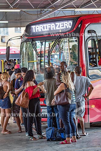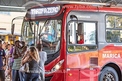 Queue of passengers - People of Marica Bus Station with the bus of the Public Transport Company of the Municipality of Marica with the electronic panel that says: zero tariff - Marica city - Rio de Janeiro state (RJ) - Brazil