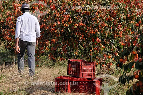 Farm worker picking persimmons - Rama Forte - Jales city - Sao Paulo state (SP) - Brazil