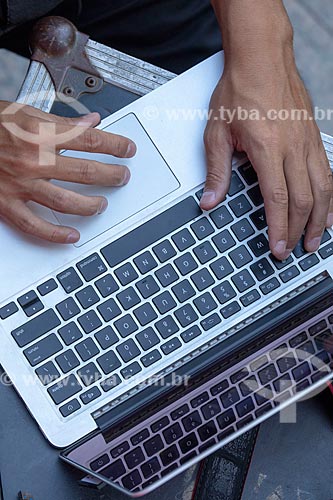 •  Detail of journalist with laptop - Olympic Boulevard during the match between Brazil x Belgium - World cup 2018 - game in which Brazil was eliminated  - Rio de Janeiro city - Rio de Janeiro state (RJ) - Brazil
