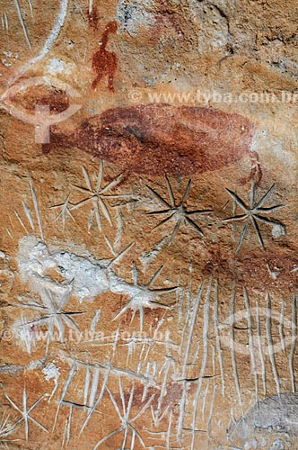 Detail of rupestrian paintings and petroglyphs - Pata da Onça Archaeological Site - Bom Jardim Mountain Range - Alcinopolis city - Mato Grosso do Sul state (MS) - Brazil
