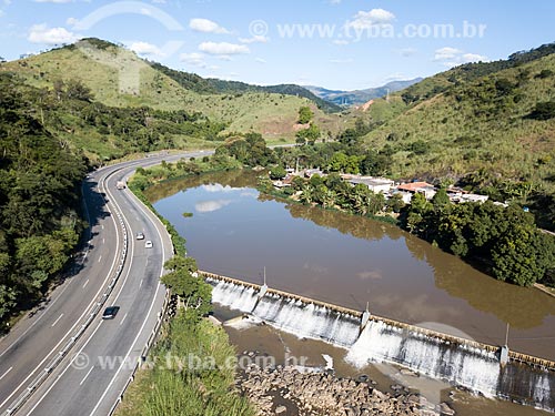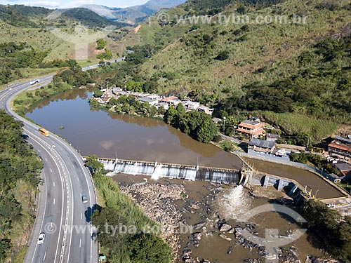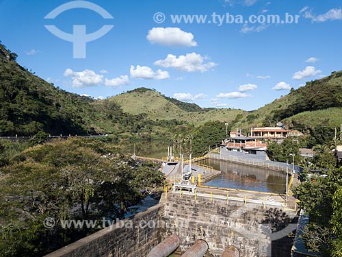 Picture taken with drone of dam of the Alberto Torres Hydroelectric Plant (1908) with the BR-040 highway to the left - Areal city - Rio de Janeiro state (RJ) - Brazil