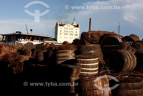 •  Subject: Piassavas (Attalea funifera) in the Sao Raimundo Port with the Miranda Correa & Cia  Beer Factory - the first brewery and ice of Manaus - in the background / Place: Manaus city - Amazonas state (AM) - Brazil / Date: 05/2010