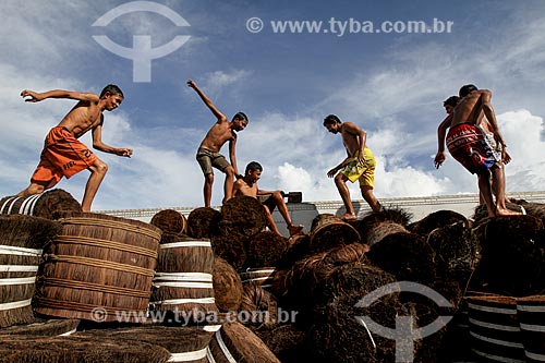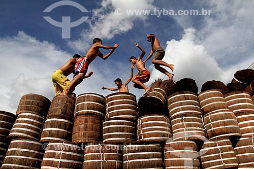 Youngs playing amid the loading of Piassava (Attalea funifera) - Barcelos city port - Barcelos city - Amazonas state (AM) - Brazil