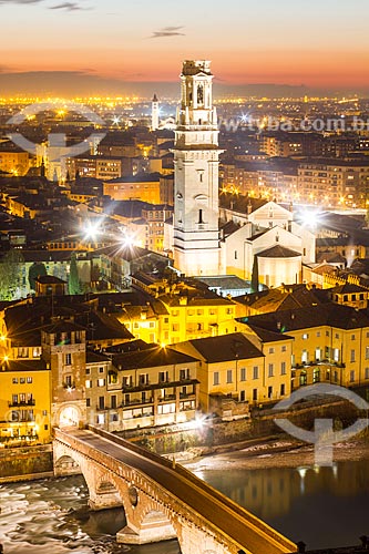 •  Subject: View of Verona Cathedral (Duomo di Verona) on the left, San Giorgio in Braida Church (Chiesa di San Giorgio in Braida) on the right, Ponte Pietra and city at evening from Castel San Pietro / Place: Verona - Italy - Europe / Date: 12/2012