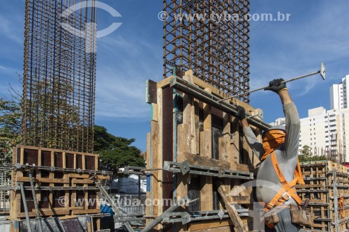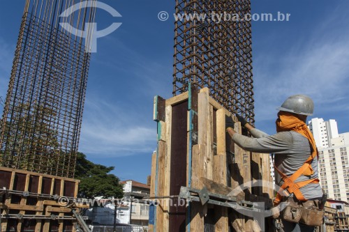 • Construction worker nailing wooden box for concreting pillar wearing mask due to coronavirus pandemic - Sao Paulo city - Sao Paulo state (SP) - Brazil