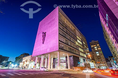 Facade of the Palace of Justice (1968) - headquarters of the Justice Court of Rio Grande do Sul state - with special lighting - pink - due to the October Rosa Campaign - Porto Alegre city - Rio Grande do Sul state (RS) - Brazil