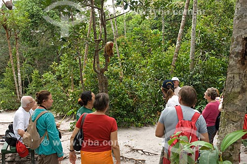 •  Subject: Female Red Bald-headed Uakari (Cacajao rubicundus), and tourists, in the Amazon Ecopark Jungle Lodge touristic complex  / Place:  Manaus - Amazonas state - Brazil  / Date: 01/2006
