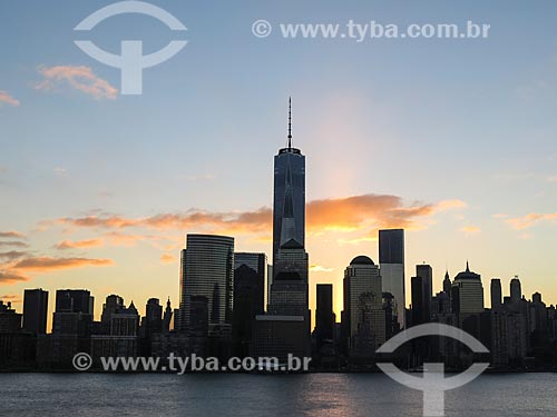•  View of Manhattan at dawn with the One World Trade Center - building in the same place where the Twin Towers were destroyed after the terrorist attacks of September 11, 2001  - New York city - New York - United States of America