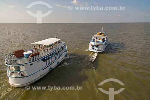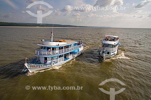 •  Aerial photo of the chalanas - regional boat - Tapajos River during the sunset  - Santarem city - Para state (PA) - Brazil