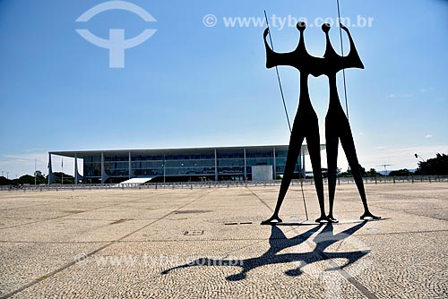 Sculpture Os Guerreiros (The Warriors) - also known as Os Candangos - with the Palacio do Planalto (Planalto Palace) - headquarters of government of Brazil - in the background - Brasilia city - Distrito Federal (Federal District) (DF) - Brazil