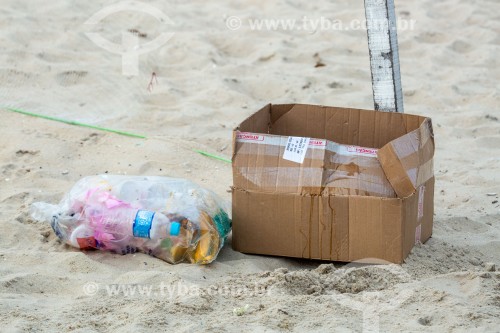 • Cardboard and plastic trash on the sand of Copacabana Beach - Rio de Janeiro city - Rio de Janeiro state (RJ) - Brazil
