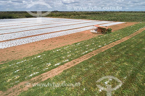 •  Picture taken with drone of the plasticulture - protected cultivation with plastic to ensure greater production and reduce threats to plantations - of muskmelon  - Mossoro city - Rio Grande do Norte state (RN) - Brazil