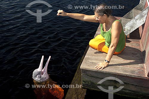 Subject: Cecilia Marigo attracting an Amazon River Pink-Dolphin (Inia geoffrensis) / Place: Rio Negro - Amazonas state - Brazil / Date: July 2007