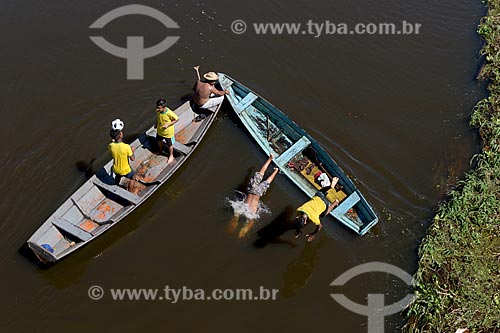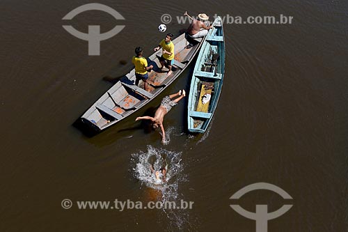 Top view of the riverine boys with the Brazilian Team Shirt playing with the Adidas Telstar - official soccer ball of the FIFA World Cup 2018 - Igarape Acu - Manacapuru city - Amazonas state (AM) - Brazil