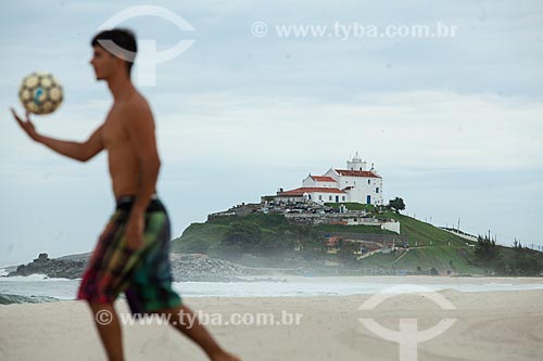 Bather playing soccer - Itauna Beach with the Our Lady of Nazareth Church (1837) in the background - Saquarema city - Rio de Janeiro state (RJ) - Brazil