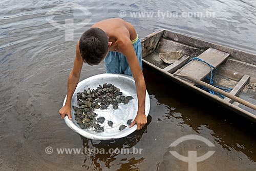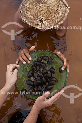 Riverine boy holding basin with puppies of giant south american river turtle (Podocnemis expansa) on the banks of the Uatuma River - Amazonas state (AM) - Brazil