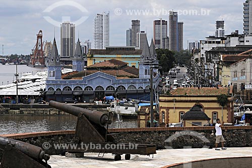 Subject: Presepio fort cannons in the foreground with the fish market, harbour and buildings in the background / Place: Belem city - Para state - Brazil / Date: May 2009