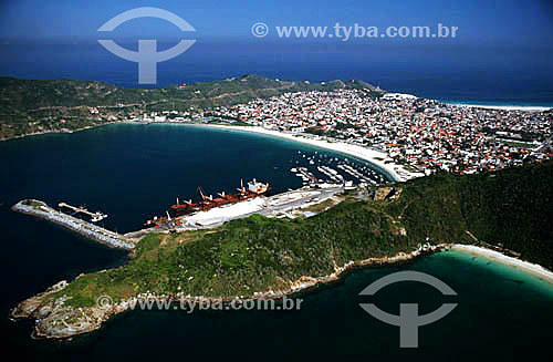 •  Aerial view of Praia dos Anjos (Angels Beach), with a marina of fishing boats to the right, Porto do Forno (Oven Port) and the mount of Pontal do Atalaia (Atalaia Point) - Arraial do Cabo city - Costa do Sol (Sun Coast) - Regiao dos Lagos (Lakes Reg