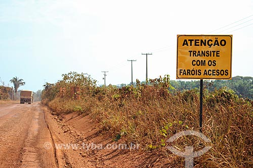 •  Plaque that says: Attention, transit with the lights on - unfinished stretch of the Porto Velho Ring Road  - Porto Velho city - Rondonia state (RO) - Brazil