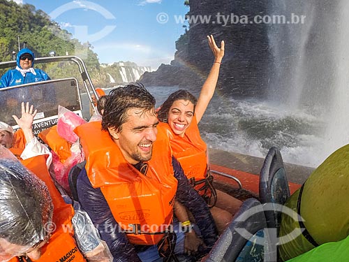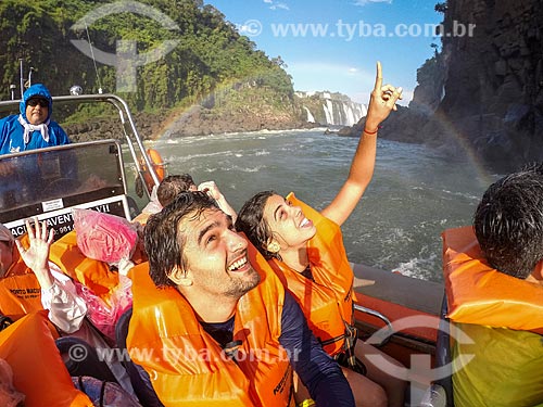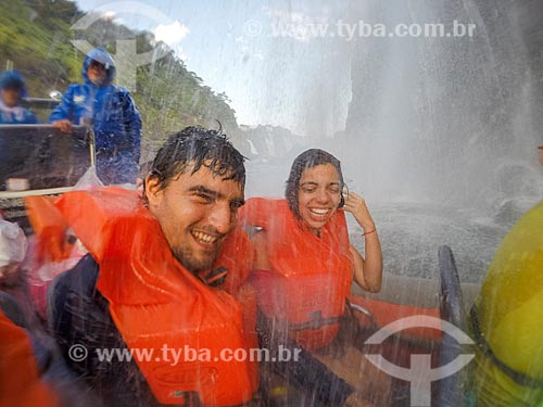•  Couple making a selfie during the sightseeing boat at Iguassu River near to Iguassu Waterfalls - Iguassu National Park  - Foz do Iguacu city - Parana state (PR) - Brazil