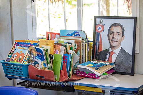School material and portrait of the Mayor of Maricá Fabiano Horta - Municipal School Guarani Bilingual Para Poty Nhe Ja (Portuguese - Guarani) - Mata Verde Bonita Village (Tekoa Ka Aguy Ovy Pora) of the Guarani tribe - Marica city - Rio de Janeiro state (RJ) - Brazil
