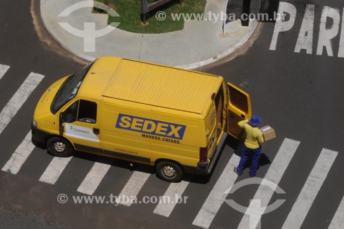 • Picture taken with drone of the postman delivering SEDEX - Sao Jose do Rio Preto city - Sao Paulo state (SP) - Brazil