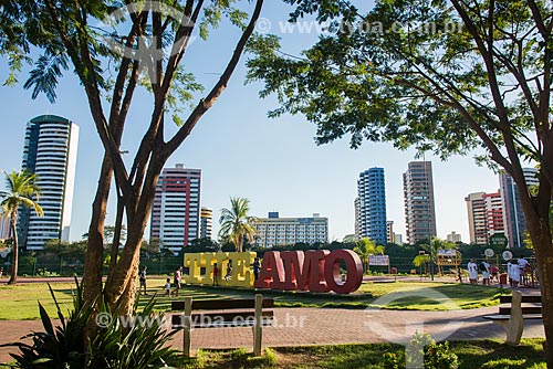 Placard that says: The Amo - Potycabana Park with the buildings in the background - Teresina city - Piaui state (PI) - Brazil