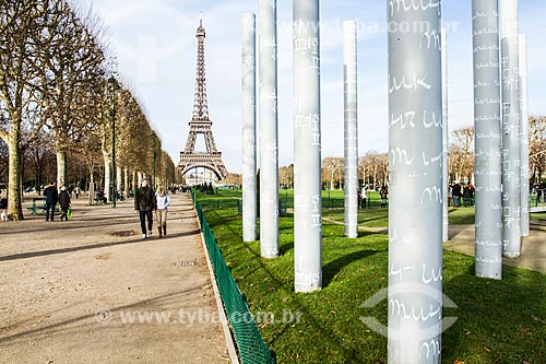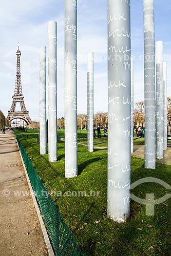 Subject: Columns of the monument Le Mur pour la Paix (The wall of peace) with the Eiffel Tower in the background / Place: Paris - France - Europe / Date: 12/2012