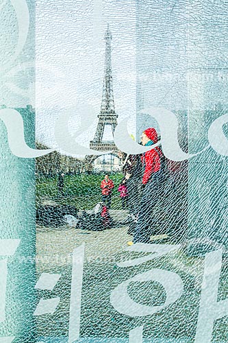 Subject: Monument Le Mur pour la Paix (The wall of peace) - have a glass facade with the word "peace" in 49 languages - with the Eiffel Tower in the background / Place: Paris - France - Europe / Date: 12/2012