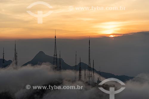 Aerial photo of the Sumare Mountain during the sunset with fog - Rio de Janeiro city - Rio de Janeiro state (RJ) - Brazil