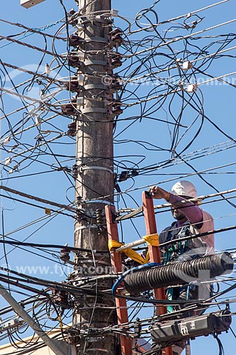 Labourer of EDP - power transmission services concessionaire - doing the maintaining the electrical network - Caraguatatuba city - Sao Paulo state (SP) - Brazil