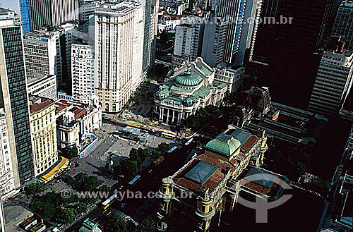 Aerial view of the center of Rio de Janeiro city showing "Praça da Cinelândia" (Cinelância Square) (1). In the center is the "Teatro Municipal" (Municipal Theater) (2), to the left, the "Assembléia Legislativa" (Legislative Assembly Building) (3),