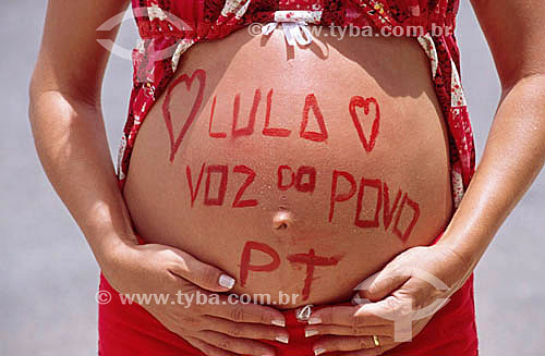 Detail of pregnant woman belly painted in honor to Lula and to PT during in the swearing ceremony of the president elected Luiz Inacio Lula da Silva - Brasilia city - Federal District of Brazil - 01/01/2003