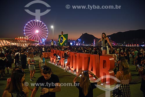 •  People photographing the placard that says: #Acreditar - entrance of the Rock in Rio 2017 - Rio 2016 Olympic Park  - Rio de Janeiro city - Rio de Janeiro state (RJ) - Brazil