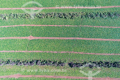 Picture taken with drone of the bell pepper and pumpkin plantation with orchard of mango - to the right - and canavial in the background - Taquaritinga city - Sao Paulo state (SP) - Brazil