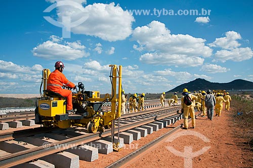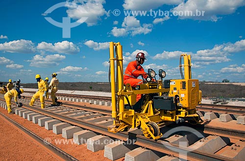 Subject: Equipment that puts the rails on the sleepers in the work of the Railroad Transnordestina - TLSA - Transnordestina Logística S/A / Place: Salgueiro city - Pernambuco state (PE) - Brazil / Date: 10/2011