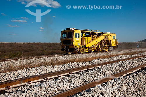 Subject: Socadeira (Tamping Machine) - machine that puts crushed stone beneath the sleeper in the work of Transnordestina Railway - TLSA - Transnordestina Logistics S / A - TLSA - Transnordestina Logística S/A / Place: Salgueiro city - Pernambuco st