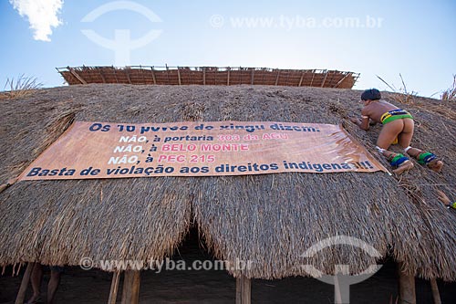 Yawalapiti put a banner against the Belo Monte hydroelectric and the government policy for indian people in Kuarup - Photo Licensed (Released 94) - INCREASE OF 100% OF THE VALUE OF TABLE - Gaucha do Norte city - Mato Grosso state (MT) - Brazil