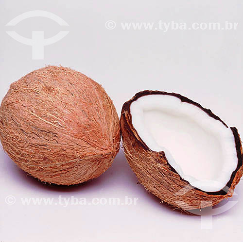 Whole and sliced coconut, showing its white "flesh" - Brazil