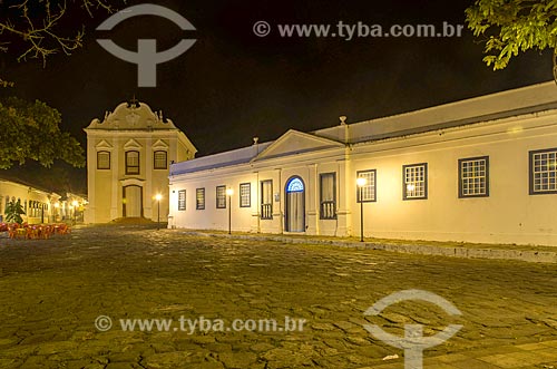 Facade of the Conde dos Arcos Palace - to the right - with the Our Lady of the Good Death Church (1779) - also now houses the Museum of Sacred Art of Boa Morte - in the background at night - Goias city - Goias state (GO) - Brazil