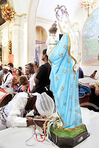 •  Congada participant praying to Our Lady of Rosary image inside of the Saint Benedict Church during the Festa de Sao Benedito (The Party of the Saint Benedict)  - Aparecida city - Sao Paulo state (SP) - Brazil