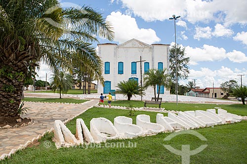 Placard that says: Mossâmedes - Damiana da Cunha Municipal Square - with the Matriz Church of Sao Jose in the background - Mossamedes city - Goias state (GO) - Brazil