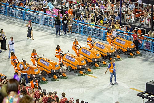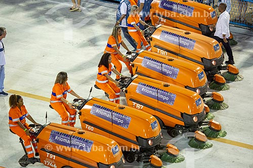 •  Street sweeper of COMLURB - doing cleaning with sweeping machine - also known as laranjinhas (small oranges) - in the Marques de Sapucai Sambadrome during interval between the samba schools  - Rio de Janeiro city - Rio de Janeiro state (RJ) - Brazil