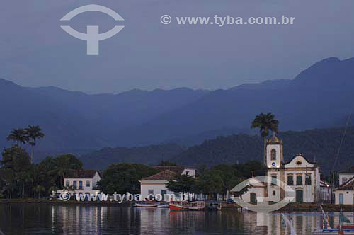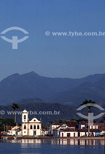 The city of Parati (1) as seen from Parati Bay showing the Igreja de Santa Rita dos Pardos Libertos (2) (Santa Rita dos Pardos Libertos Church) - Costa Verde (Green Coast) - Rio de Janeiro state - Brazil (1) The historic colonial city of Parati dat