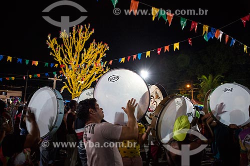 •  Reveler playing tambourine during party of the Death of Ox - time of death of the main character of the Bumba-meu-boi  - Sao Jose de Ribamar city - Maranhao state (MA) - Brazil